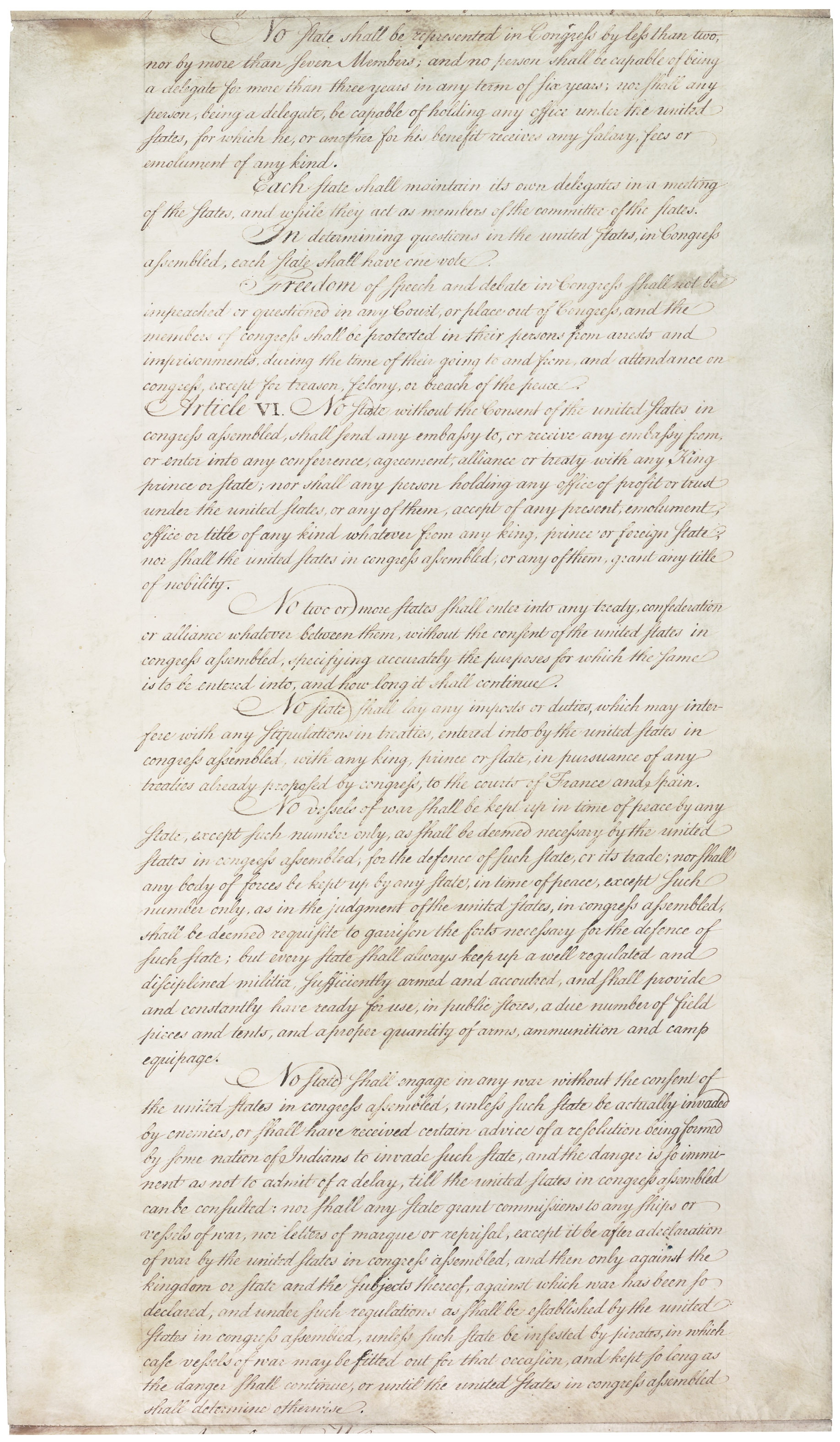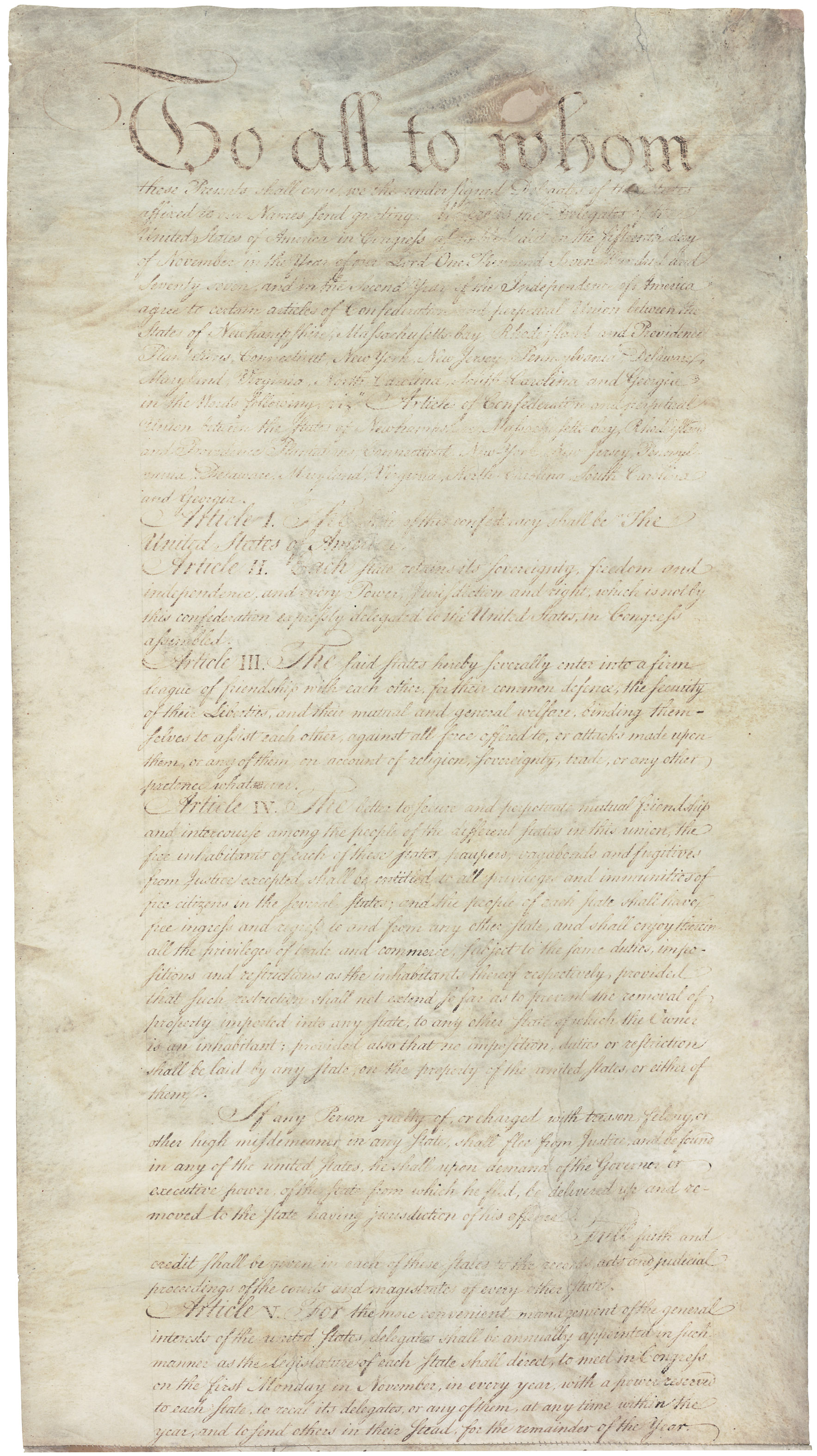 The Articles of Confederation and Perpetual Union was the first written constitution of the United States. Written in 1777 and stemming from wartime urgency, its progress was slowed by fears of central authority and extensive land claims by states. It was not ratified until March 1, 1781. Under these articles, the states remained sovereign and independent, with Congress serving as the last resort on appeal of disputes. Significantly, The Articles of Confederation named the new nation “The United States of America.”